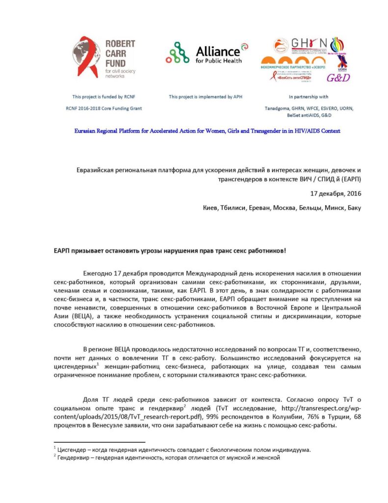 ЕАРП призывает остановить угрозы нарушения прав транс секс работников!