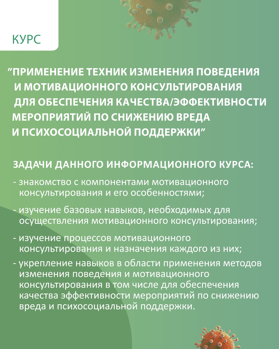 – укрепление навыков в области применения методов изменения поведения и мотивационного консультирования в том числе для обеспечения качества эффективности мероприятий по снижению вреда и психосоциальной поддержки.