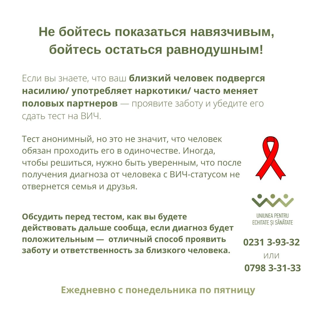 Если вы знаете, что ваш близкий человек подвергся насилию/ употребляет наркотики/ часто меняет половых партнеров — проявите заботу и убедите его сдать тест на ВИЧ.